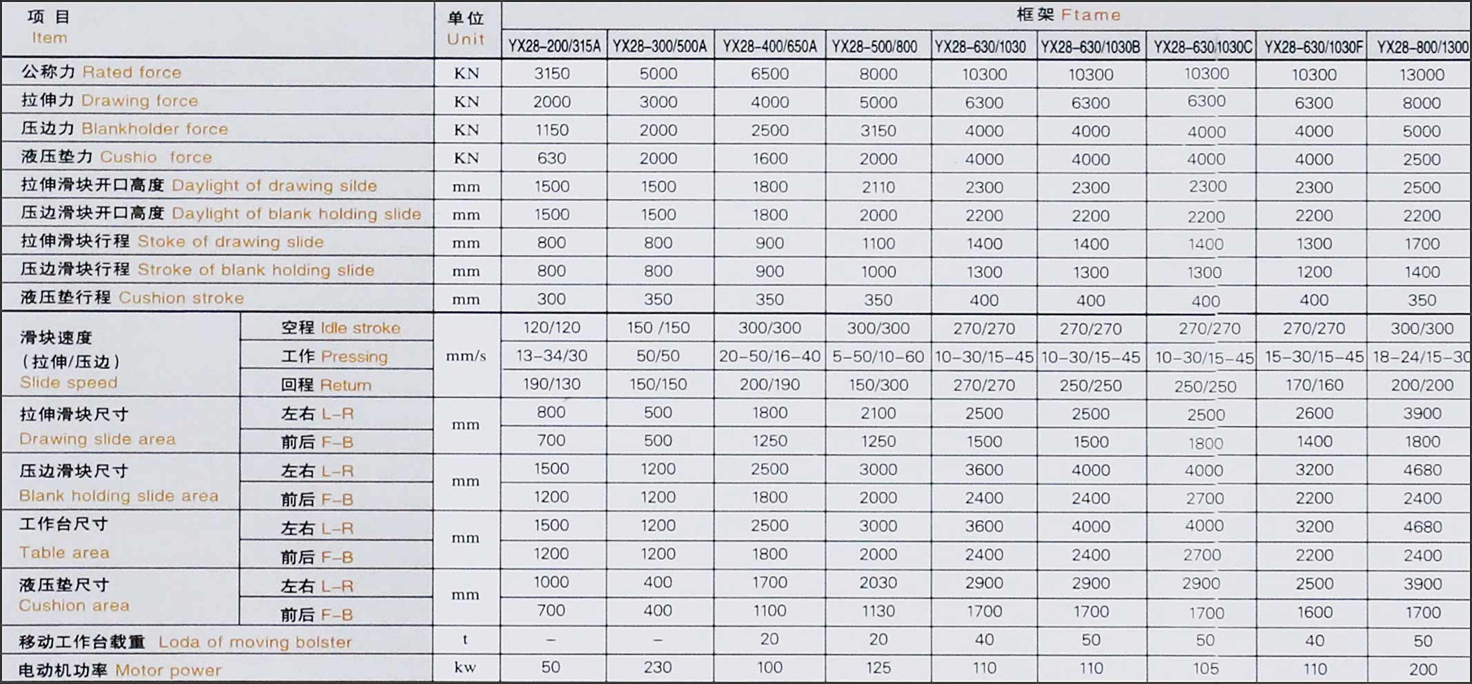 移動工作臺沖裁緩沖裝置壓邊滑塊,液壓墊死角分別調壓裝置(拉伸不對稱零件)光電保護裝置換模用浮動導軌和滾動托架